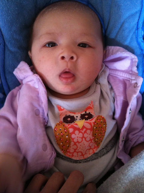 Avery loves her owl tee. She started cooing and ah-gooing a few weeks ago, and I've been delighted and willing to overcome her explosive temper and explosive, er, tendencies ever since. I don't know if there is a sweeter sound than her voice. And she seems to coo a bit more in this outfit.